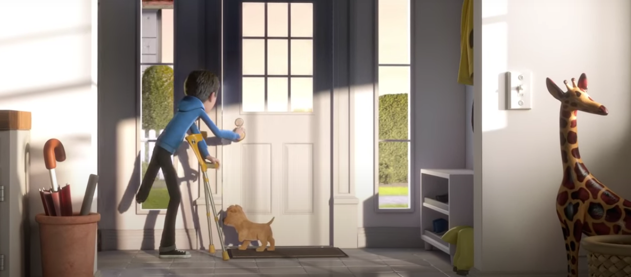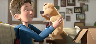 At the beginning of the story the boy was playing some video games then he's mum home with a present for him and he open the box and when he see the dog he was happy but when he's see the foot he didn't like it because the dog has a problem in the feet and he throw the dog away from him then the dog see the ball under the desk and the dog is trying to get it and the boy is not focusing at the games.